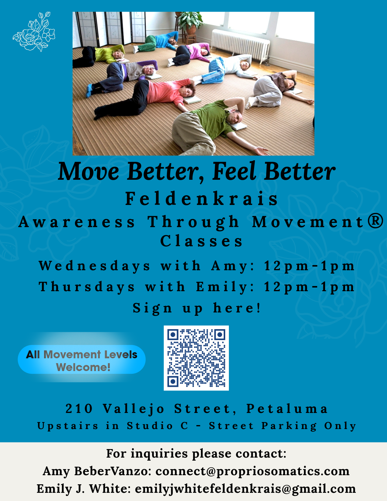 My name is Emily J. White and I am a Guild Certified Feldenkrais Practitioner. I give one on one Function Integration® sessions and teach Awareness Through Movement® classes in Petaluma, CA. To Book sessions and find out about my classesPlease e-mail me: emilyjwhitefeldenkrais@gmail.com